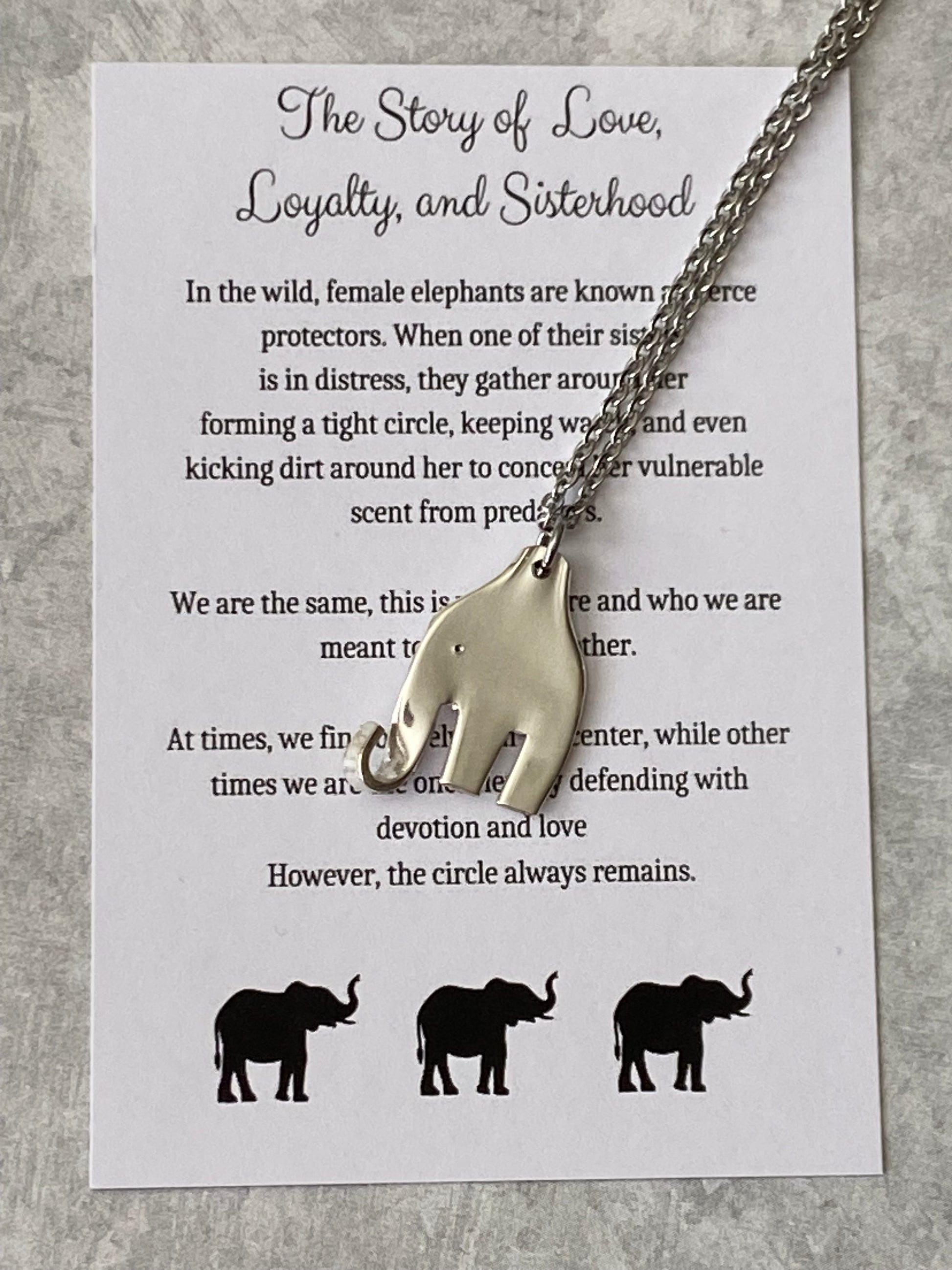 Baby elephant necklace made from a vintage cocktail fork. Comes with a “Sisterhood” card. Perfect for gifting to your girlfriends. 18” stainless steel chain included. Can be switched out for 20” chain. Leave a message in the comment section.