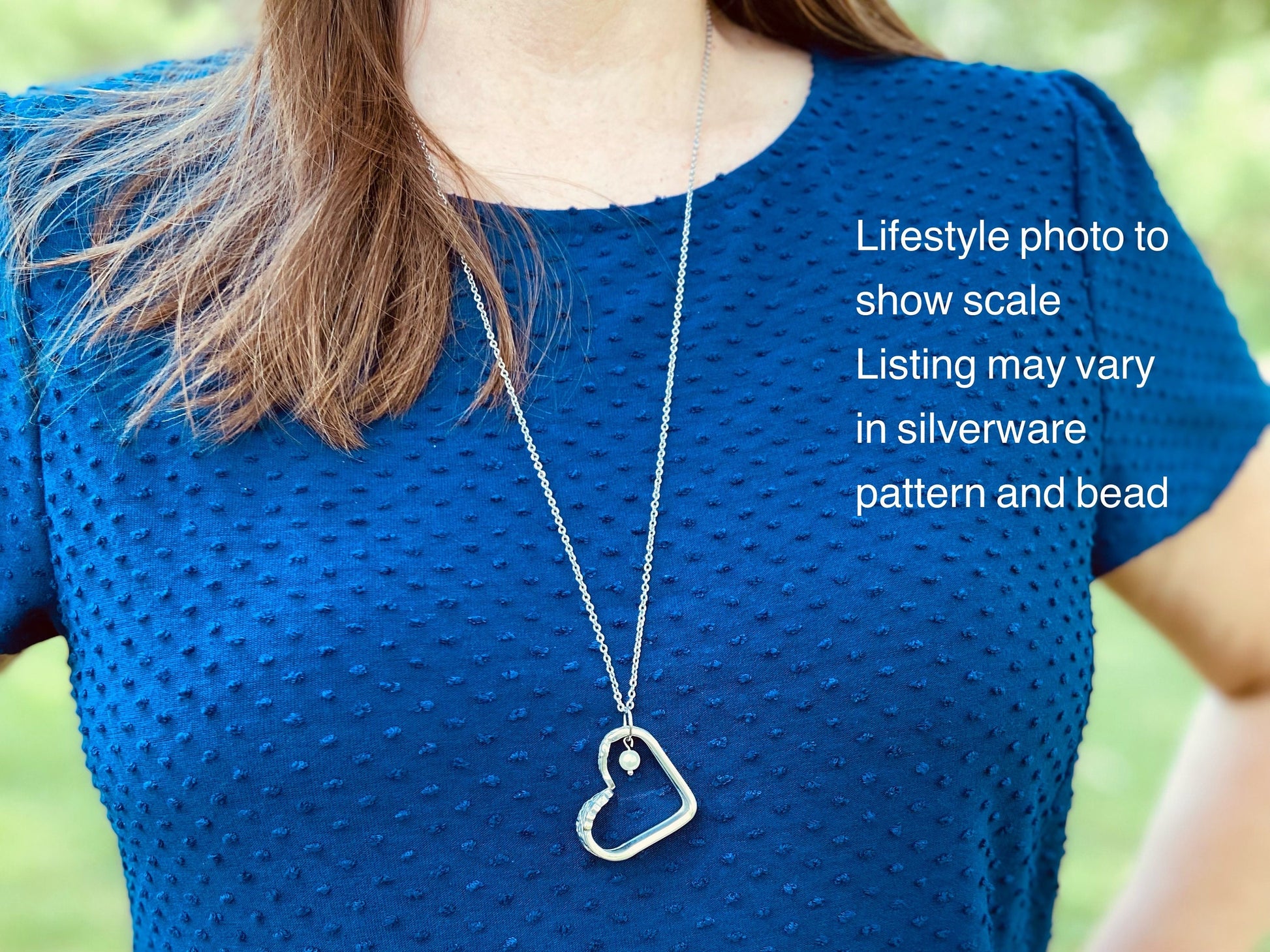 Beautiful handmade heart upcycled from vintage silver plate silverware. The pattern name is Daffodil and was produced in 1950. The heart is approximately 1 1/2" X 1" A stainless steel 30" chain is included.
